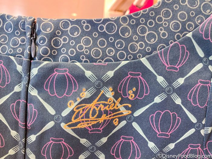 Ariel’s trusty companion, Flounder, also makes an appearance through an embroidered detail on the dress.