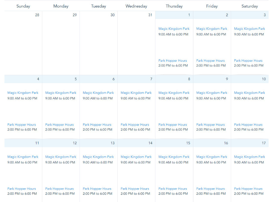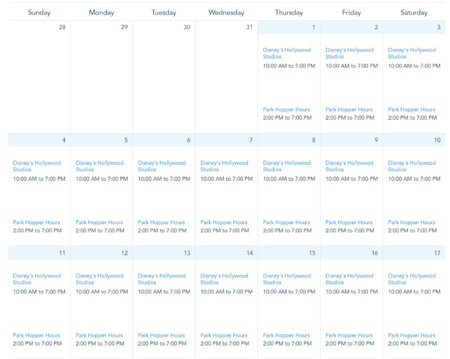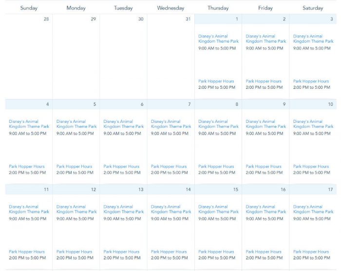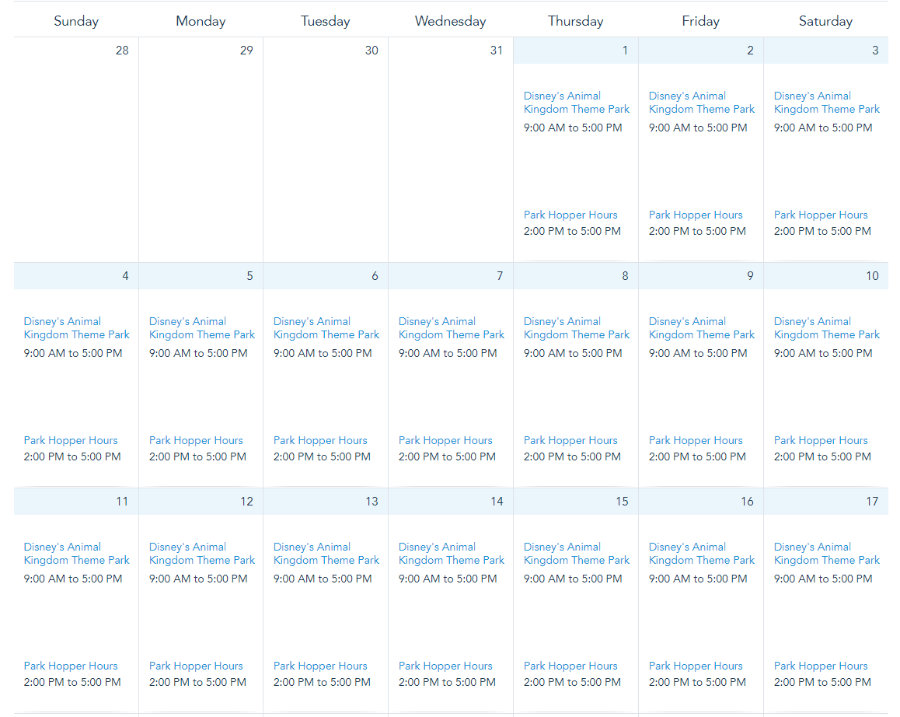 Finally, Animal Kingdom’s hours will remain the same throughout the month: from 9AM to 5PM.