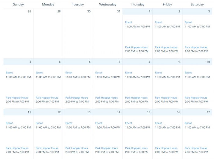 EPCOT’s hours will remain the same: from 11Am to 7PM.