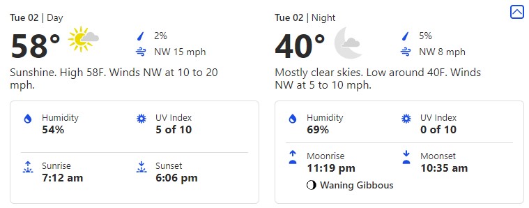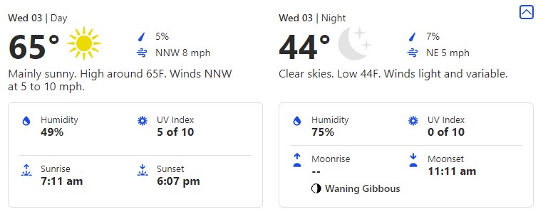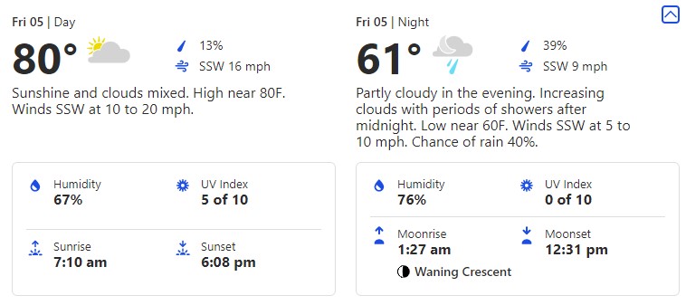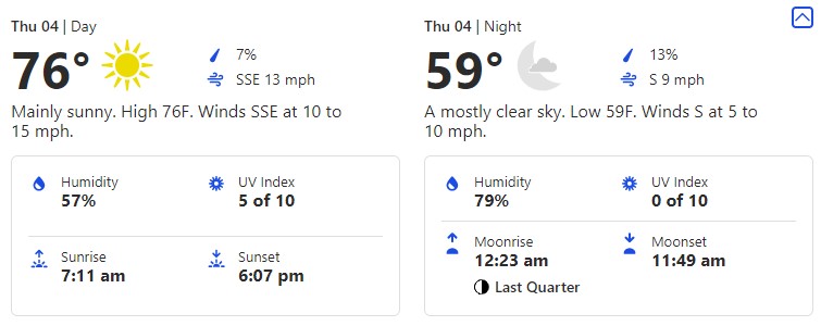This is a day you’re going to want to make sure you break out those layers. 76 degrees is toasty, but if you’re out later that 59-degree low could leave you shivering.
