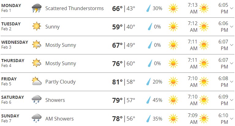 And we’ll wrap up our week on February 7th with the warmest temperatures sitting at a toasty 81-degree high and a comfy 61-degree low.