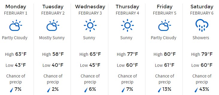 Monday, February 1st will start the week with cooler temperatures than the ones we’ve been seeing. That day is going to max out at a 62-degree high and we’ll see 42 degrees at night. Hmm… That’s going to feel pretty chilly once the sun goes down!