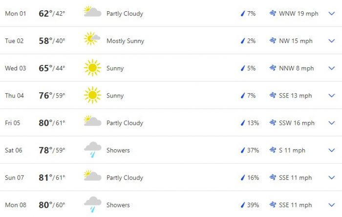 Here is a full overview of the week according to The Weather Channel. Temperatures fluctuate over the course of the week but seem to get warmer as the week goes on. We’re looking at a range of 50s to 80s highs and 40s to 60s lows.