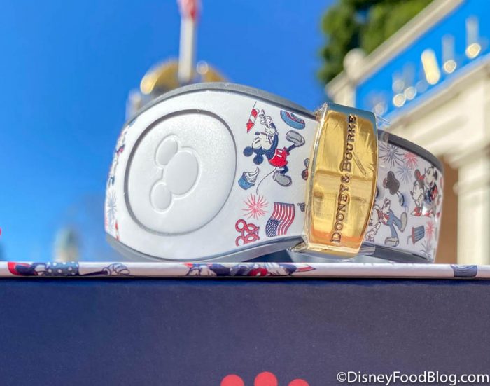 And, today at Magic Kingdom, we spotted the hard-to-find Americana MagicBand from Dooney & Bourke in Ye Olde Christmas Shoppe! This band is FULL of patriotic details! Like other Dooney & Bourke MagicBands, the logo can be spotted on a gold piece right on the band.