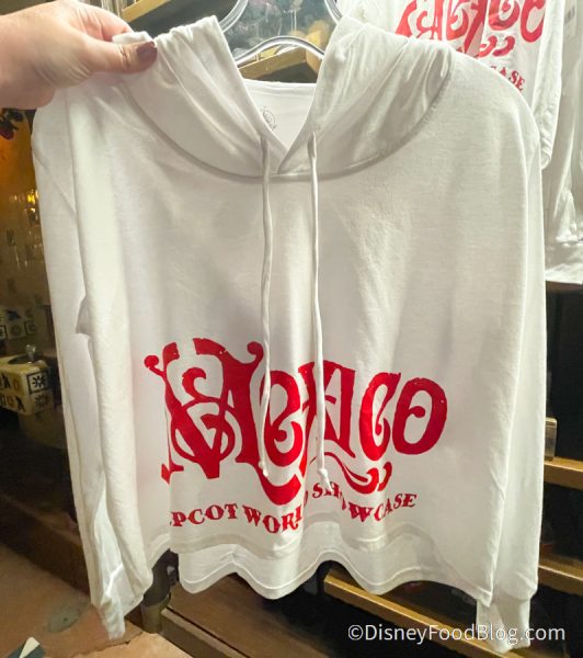 We found a new shirt at the Mexico Pavilion. It’s a white, cropped long-sleeve shirt that says, “Mexico EPCOT World Showcase,” across the front. Plus, it has a hood!