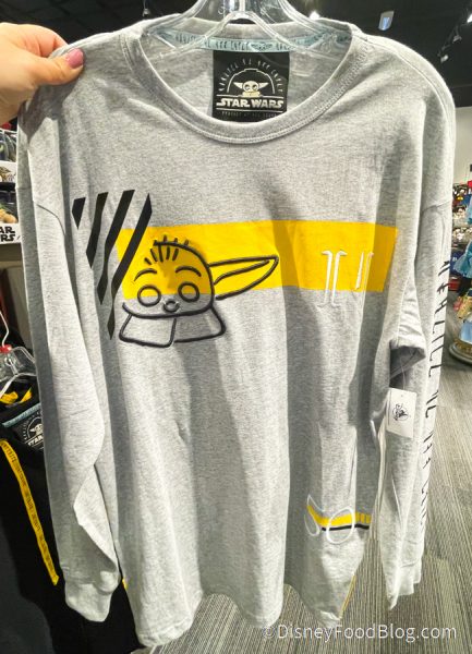 The Child Streetwear collection has officially landed at Disney World! We found the grey long-sleeve t-shirt with Baby Yoda (aka Grogu) on the front…