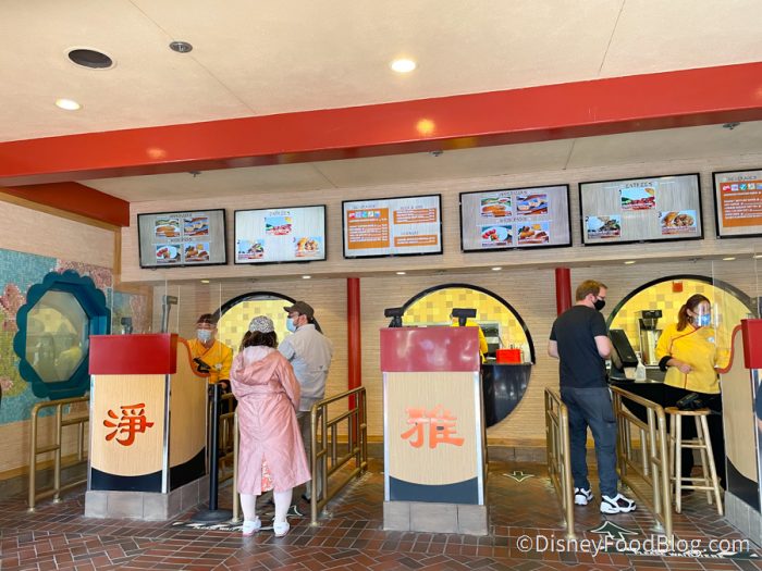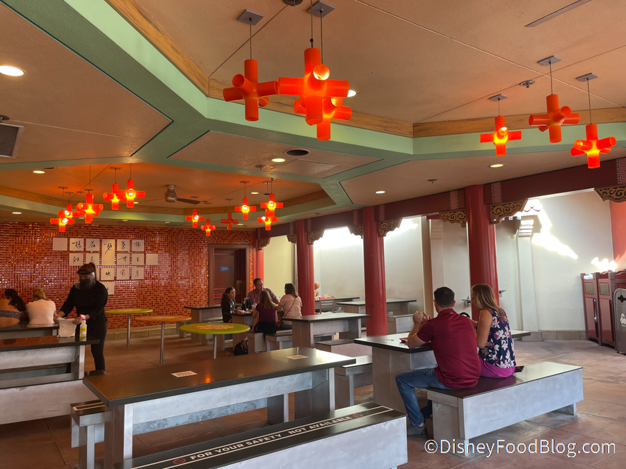 One restaurant that has not reopened is Nine Dragons Restaurant in EPCOT’s China Pavilion. Except that its dining room IS open now, but not in the way you might think. When we stopped by China’s counter-service spot Lotus Blossom Cafe today, we discovered something interesting after getting our food.