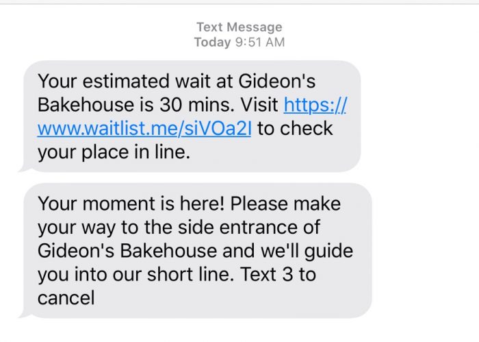The virtual queue sends guests a text with an estimated wait time, as well as a follow-up text when it’s time for them to return. The demand for Gideon’s has remained high since the opening, and the location has been keeping a close eye on the traffic patterns.