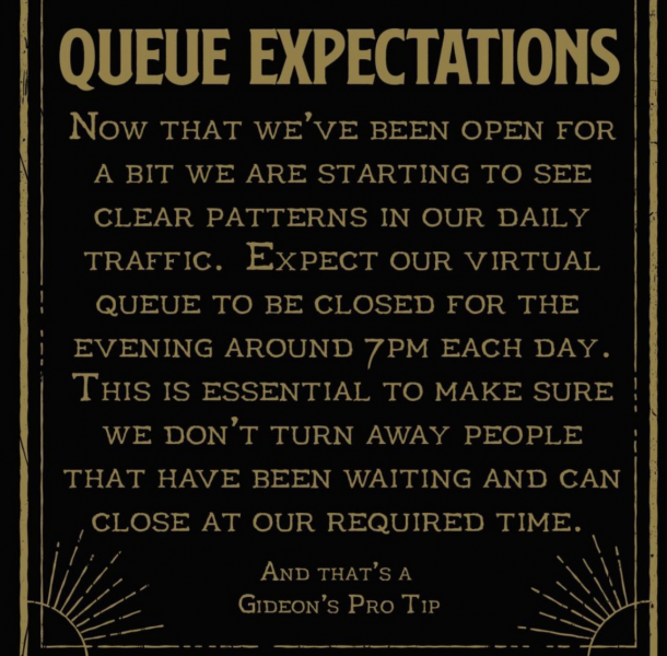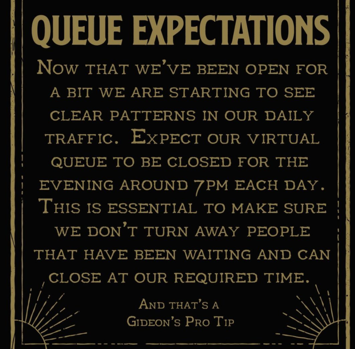 The update states that after observing regular traffic patterns, guests can expect the virtual queue to close around 7PM each day. This will both minimize the chance that guests will be turned away after already obtaining a spot in the queue and allow the location to close on time.
