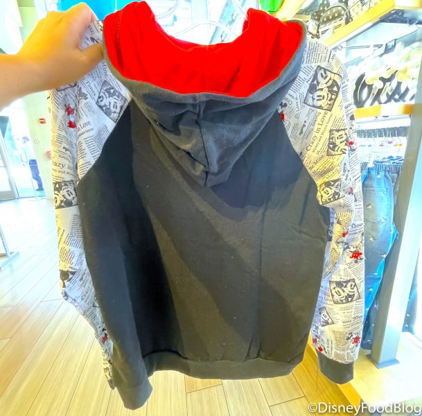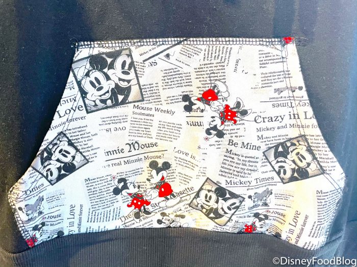 The Mickey and Minnie Newspaper Hoodie is red, black, and white with newspaper print that pops on the sleeves…