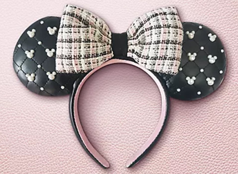 Take a peek at the sleek and fashionable Tweed & Pearl Minnie Ears Headband that’s coming soon online! The ears are quilted with tiny pearl decorations and the bow is made from a pretty tweed with subtle pink details.