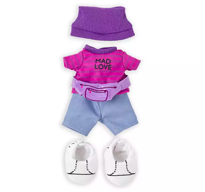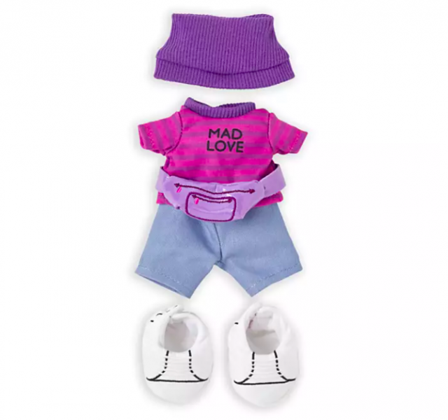 The Cheshire Cat also has his own look. This shirt says “Mad Love” and comes with a little purple fanny pack!
