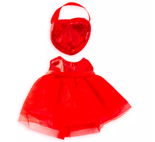 The ruby red dress has a sequin bodice and organza top layer to that puffy skirt. There’s also a red heart-shaped handbag with sequins to match! This set is $12.99.