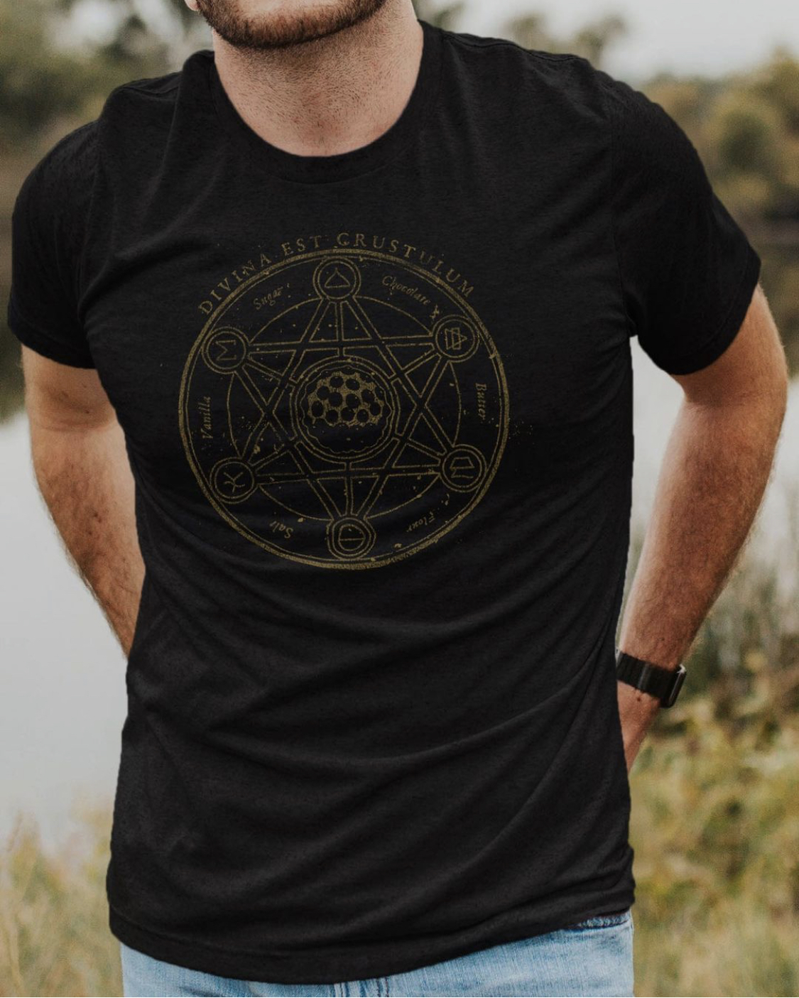 Let’s dig in! The first new offering is the Alchemical Recipe Shirt, which lists some of Gideon’s ingredients for their Chocolate Chip Cookie (of course, the secret ones are left out!). The curved text on top reads “Divina Est Crustulum,” which is Latin for “The Cookie Divine.” Maybe these cookies are magical, after all!