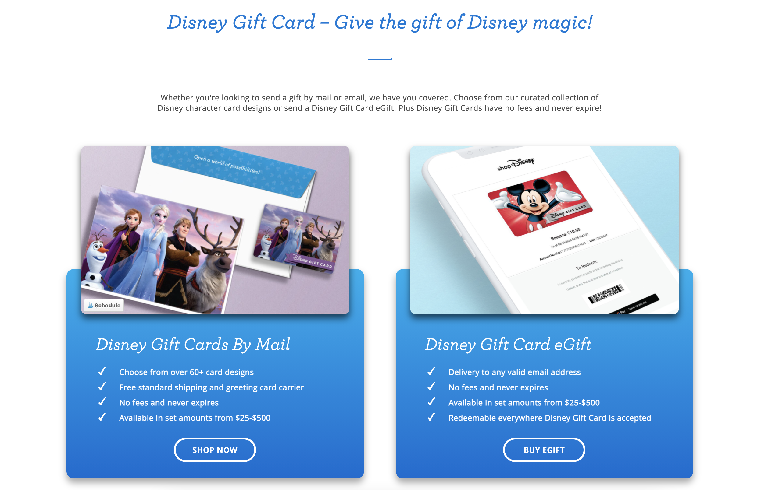 In addition to managing your own cards, you can gift someone a Disney Gift Card with a few simple steps. You have the choice of ordering a Disney Gift Card by Mail or a Disney Gift Card eGift. When you shop gift cards by mail, you can select from over 60 card designs, including Star Wars, Frozen, The Incredibles, and more.