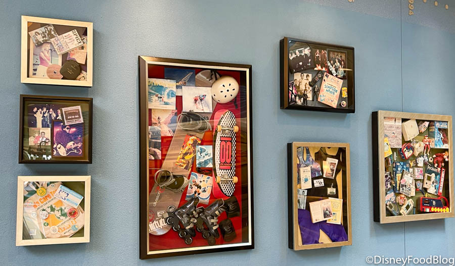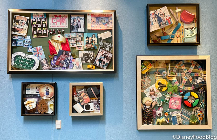 Let’s kick things off in the hotel lobby, where great Disney vacations start. The lobby at Pop Century has a really neat feature with a gallery wall of shadowboxes!