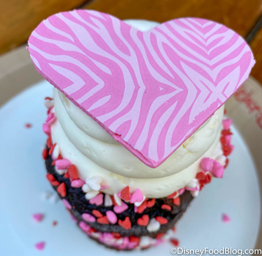 Valentine’s Day treats have arrived at Disney World, and we tried the new Valentine’s Day Cupcake at Creature Comforts. This is a chocolate cupcake with cherry filling topped with vanilla frosting, and with a zebra-striped heart.