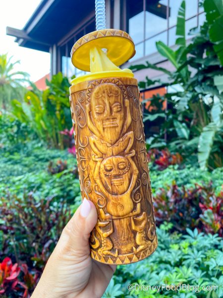 We’re getting total Tiki Room vibes from this plastic sipper, just take a look at those stacked tiki men! They’re wearing crowns, as anything containing delicious Dole Whip deserves!