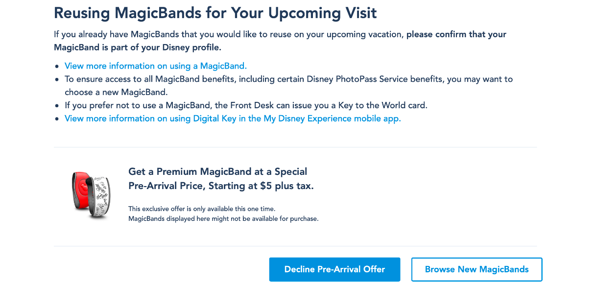 Brandon, thanks for reaching out. I just logged into my own account to see what this is like on the website, and basically, under my name, there’s a clickable “Reuse a MagicBand” link that, when clicked, opens a box with information about being sure you confirm (for yourself — not for Disney) that the MagicBand(s) you want to use is in your account and activated. You are not confirming for Disney, really, even if you click “Decline Pre-Arrival Offer”, which just defaults your profile’s setting to “Reusing a MagicBand.” However, even then you can still click “Select a New MagicBand” and be taken right back to the same screen you normally see for purchasing a MagicBand. In your situation, I think you’ll be fine to have the MagicBands you want to bring with you in your account/profile and activated for your trip. I don’t see any changes to that aspect of it. I can confirm that when I click My MagicBands and Cards in My Disney Experience, all of my old MagicBands still show there with options to activate. I hope this helps!