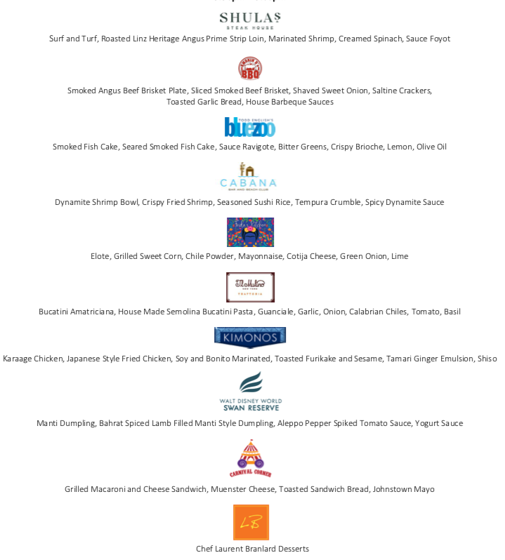 This all-inclusive dining event offers 10 food stations and 22 beverage stations that represent restaurants from the resorts, including Todd English’s bluezoo, Kimonos Sushi Bar, Shula’s Steak House, and more! Check out the menu below!