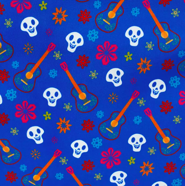 First up is this Coco Loungefly. We’ve seen some other Coco designs online, but now this one is seizing its moment and joining the bunch! It features Miguel, Ernesto, and Hector surrounded by guitars, ‘Dia de los Muertos’ art, and embroidered floral filigree. We love the pop of bright blue!