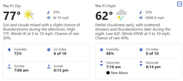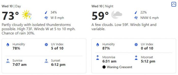 For Thursday, February 11th, we’re seeing a pretty mellow day in the high-70s and a moderate evening in the low 60s.