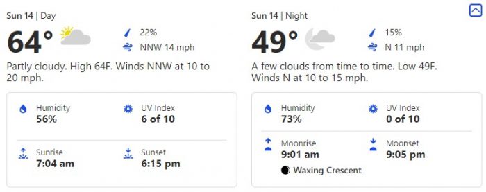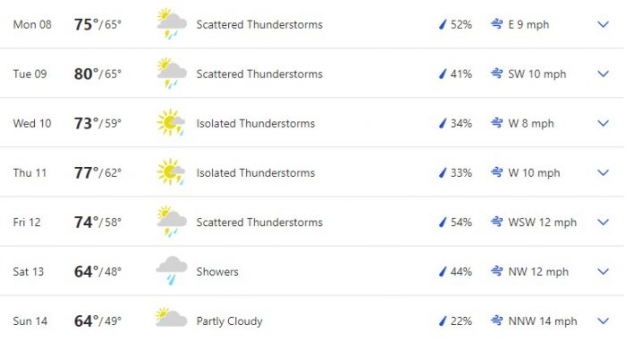 Here is a full overview of the week according to The Weather Channel. Temperatures are projected to be relatively warm for most of the week before a little drop at the end. We’re looking at a range of 60s to 80s highs and 40s to 60s lows.
