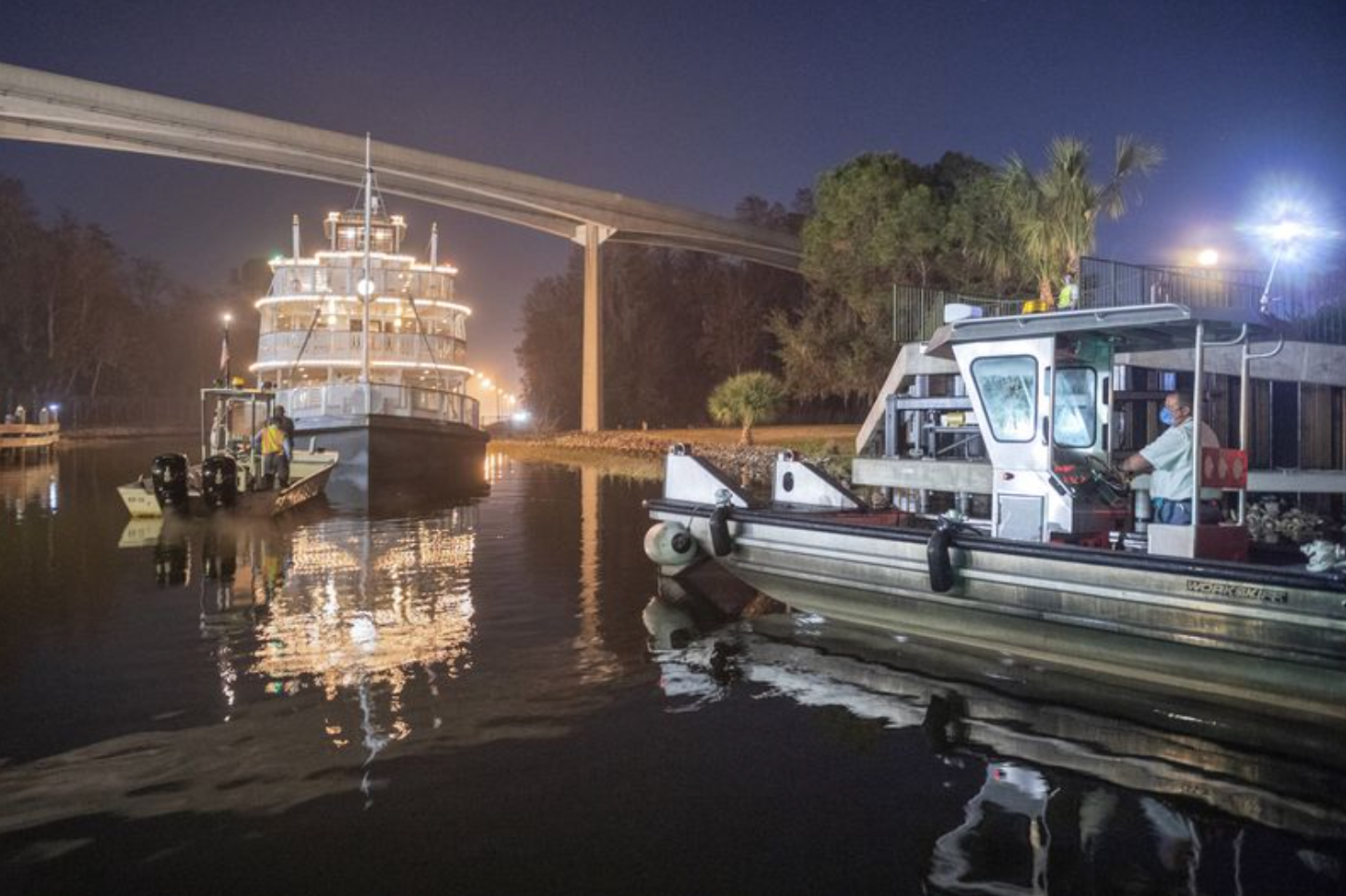 Returning the Liberty Belle to Magic Kingdom was even more complicated, taking three nights. A team of underwater divers was used to reconnect the riverboat to her Rivers of America track by hand. Holy moly! Who knew moving this historic vessel would be such a process?