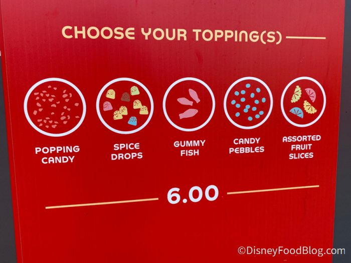 Then you can start adding your toppings. Your choices are Popping Candy, Spice Drops, Gummy Fish, Candy Pebbles, and Assorted Fruit Slices. During our visit, we only saw Popping Candy, Candy Pebbles, and Fruit Slices available.