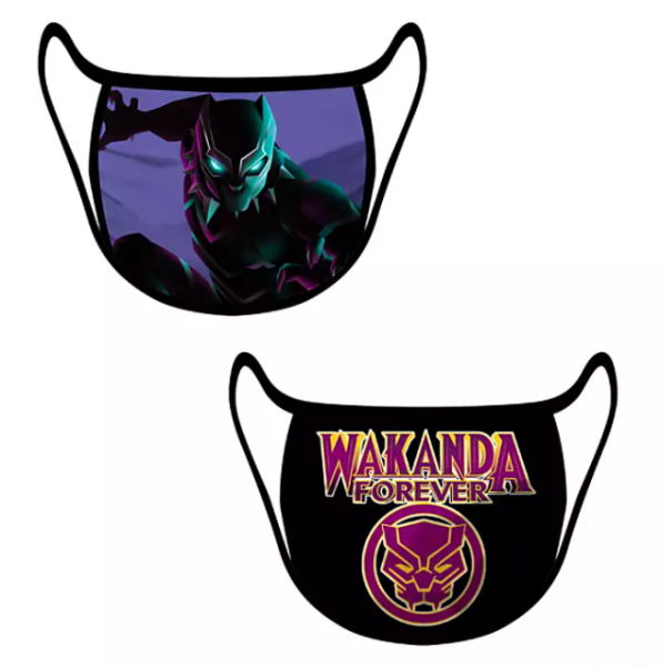 Our first mask set is a pretty original design. This Black Panther set of two features the Black Panther himself and the slogan “Wakanda Forever.” Even though we’ve seen a Black Panther mask before, we’ll give Disney credit for creativity here. We imagine wearing these would encourage you to channel your inner superhero!