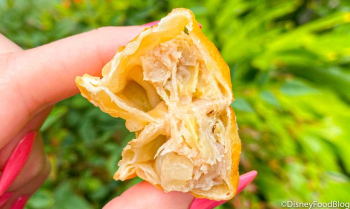 The inside tasted primarily of pork and cabbage. We’re all for having savory snack options in Disney World so we LOVED this! The sauce was an awesome addition too. Keep in mind, the orange was a little more forward than we expected so if that’s not your jam, you might not be a fan.