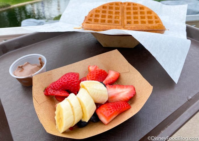 Okay, we’re going to take you through this step by step. To start, order the Nutella and Fresh Fruit Waffle Sandwich from Sleepy Hollow with all the ingredients separate. You’ll get a plain waffle, fruit, and some Nutella for $8.29.