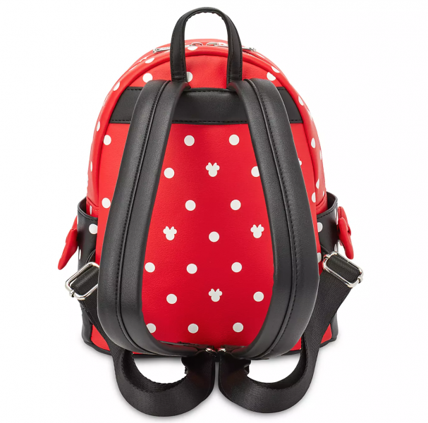 It’s currently available for pre-order on shopDisney, and it has that classic Minnie Mouse style. It’s red and black with white dots, and some of the dots are little Minnie heads. The front pocket has a large bow, which really completes the ensemble. We love the two tones and the over-the-top bow.