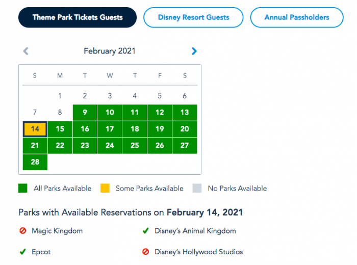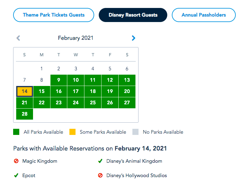 Resort Guests have a lot more luck. Previously, they had limited availability most of this week and next. Now, guests can visit any of the 4 parks any day except Valentine’s Day, where they’ll have to choose between EPCOT and Disney’s Animal Kingdom.