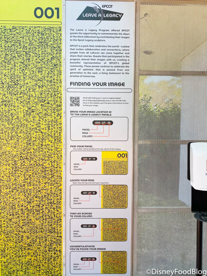 You can see the panels have numbers on the top to help guests find their photos. If you’re looking for your spot in these new Leave A Legacy tiles, you can use your phone or another smart device to scan a QR code there. Your smart device will then up a tile finder search feature. You can use this to get the coordinates to a specific tile location.