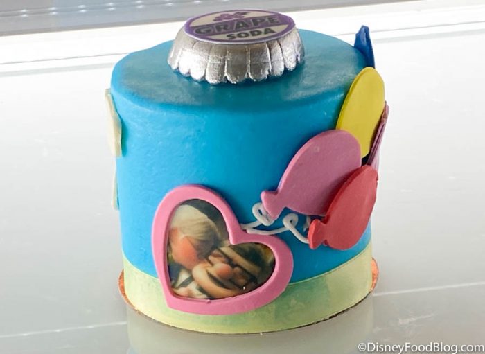 The “Love is in the Air” petit cake is inspired by Up! It features a sweet heart-shaped picture of Carl and Ellie that’s being carried away by balloons. The cake is a sky blue and there’s even a grape soda pin.