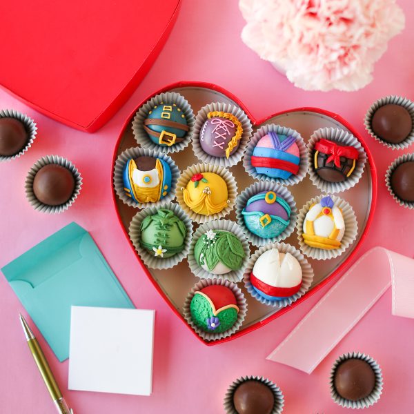 Place the finished truffles inside mini cupcake liners and into a box. There you have it: your own princess candies! This recipe is such a fun tribute to your favorite Disney couples. Stay tuned for more Disney news here at DFB!