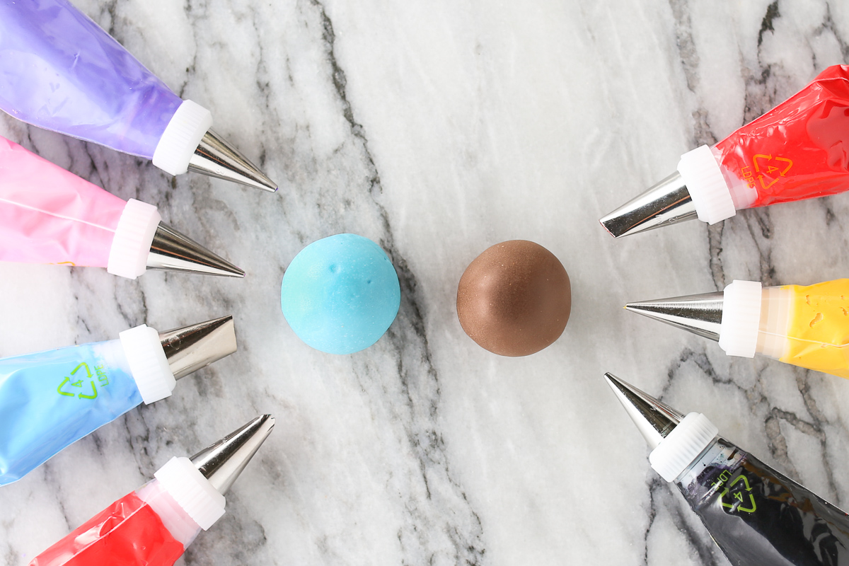 Step one: Dip one truffle ball in sky blue melted chocolate, and another in brown melted chocolate. Allow to set.