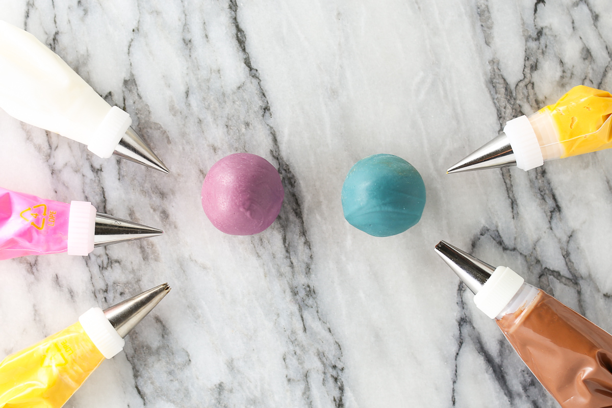 Step one: Dip one truffle ball in purple melted chocolate, and another in teal melted chocolate. Allow to set.