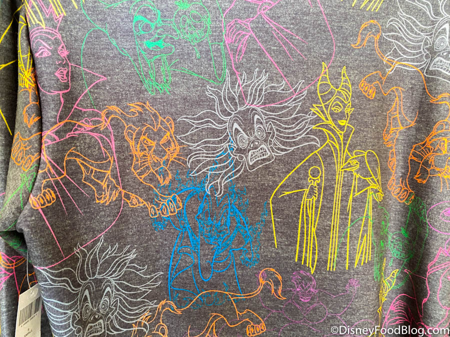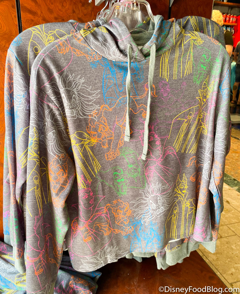 We also found a Villains hoodie that we’ve previously seen in Downtown Disney over at Disneyland Resort. It features colorful outlines of Scar, Cruella de Vil, Maleficent, and more.
