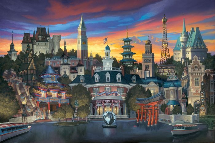 I sure wish I could see these up close or at least large enough to actually see the added details. I enlarged my computer screen to 500% and still did not have much success. Looking at Magical Reflection, I’m sure I can see several of the 21 opening day details, but even with a magnifying glass, could only identify the Jungle Cruise and Mr. Toad’s Wild Ride. In the piece that he did for EPCOT, if I am correct, I identified all 13 country icons (easy enough) plus 25 hidden Mickey’s and 4 additional details. And at that, I probably spent well over an hour straining my eyes.