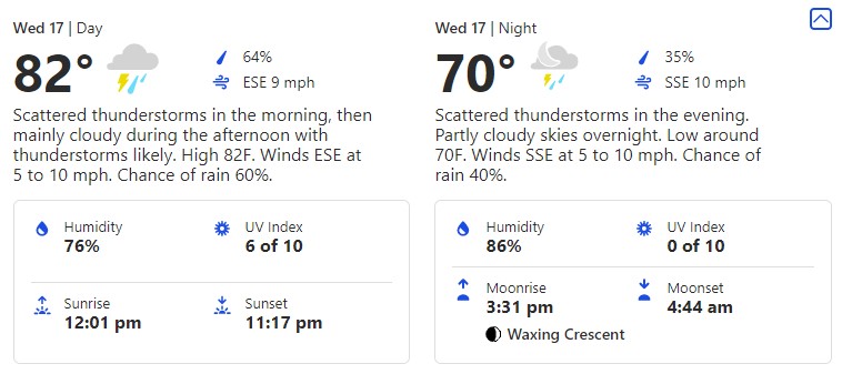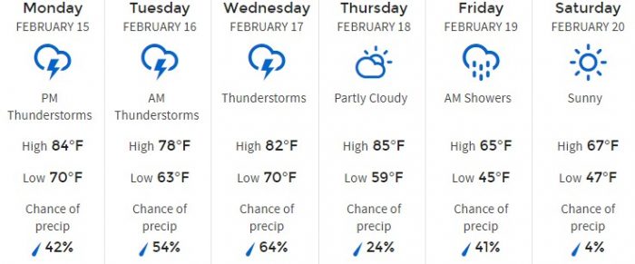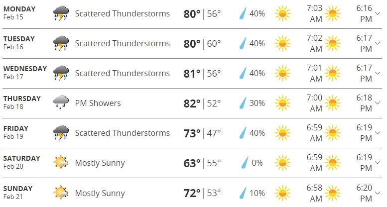 The next day, February 16th, brings us slightly cooler temps hitting 76 degrees during the day and dropping that low down to 64 degrees.
