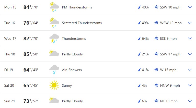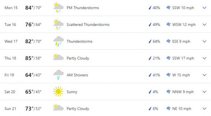 Here is a full overview of the week according to The Weather Channel. Temperatures are projected to be relatively warm for most of the week before a little drop at the end. We’re looking at a range of 60s to 80s highs and 40s to 70s lows.