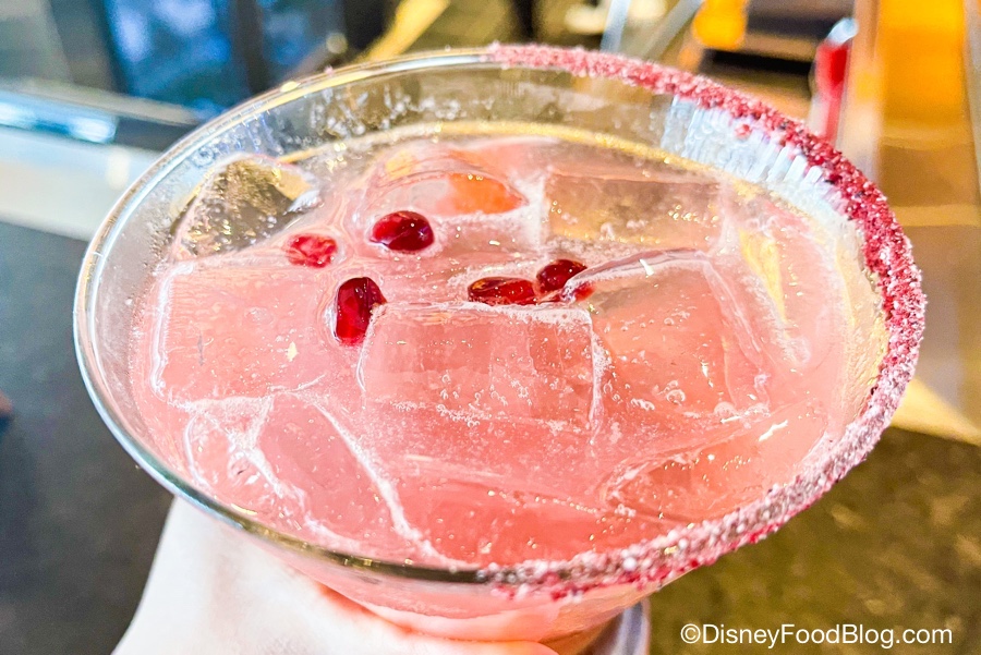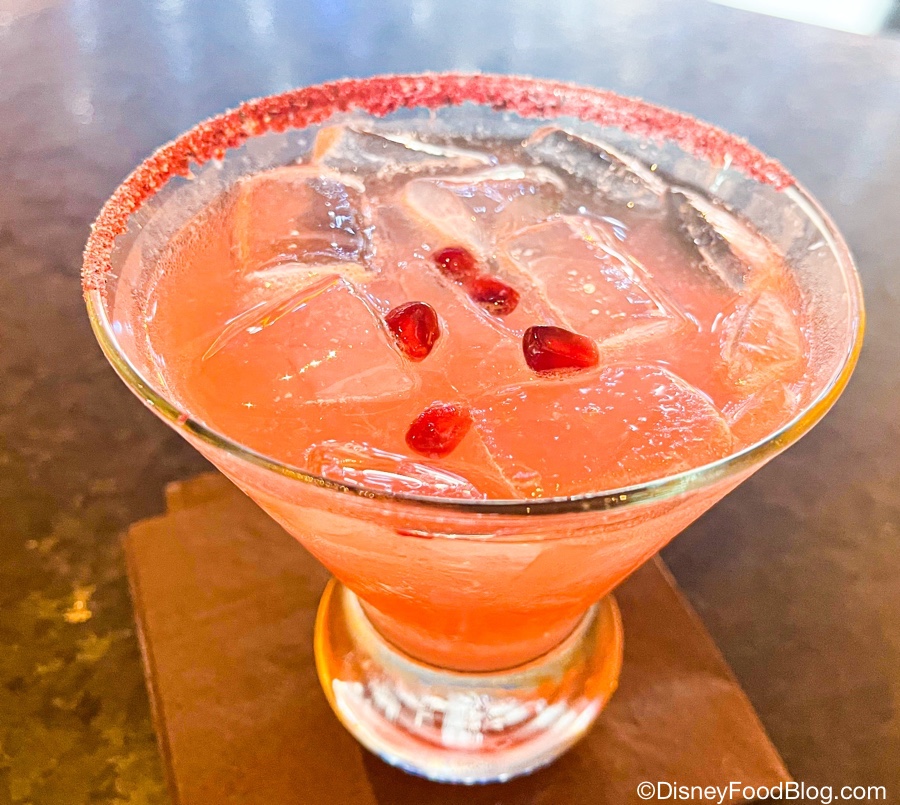 It’s smooth and sweet, light on tequila flavor and heavier on the pomegranate. It’s finished with a rose popcorn salt rim, and a smattering of juicy pomegranate seeds! That salt has a buttery popcorn aftertaste, which can be a love it or hate it kinda flavor (spoiler alert: we love). It doesn’t overpower the margarita, but you can certainly taste the buttery popcorn flavor.