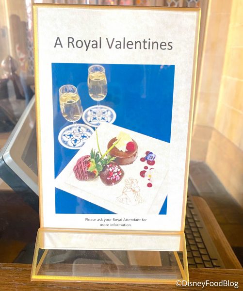 Ask your “Royal Attendant” for more information if you are interested, but it includes 2 chocolate covered strawberries, 2 glasses of champagne, and a chocolate mousse cake with raspberry. Do you think this dessert could be our actual Valentine this year? Cinderella’s Royal Table is also open with a prix fixe menu, so you can have a lunch or dinner fit for royalty as you celebrate the holiday!