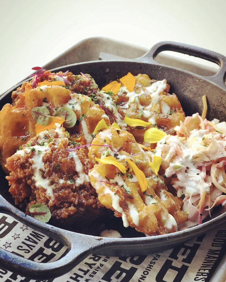 As with so many inventive things they do here, The Polite Pig’s version is a “twist,” eschewing the typical combo for a cast-iron skillet FILLED with crispy fried chicken pieces and tater tot waffles! Repeat: TATER. TOT. WAFFLES. This is not a drill!