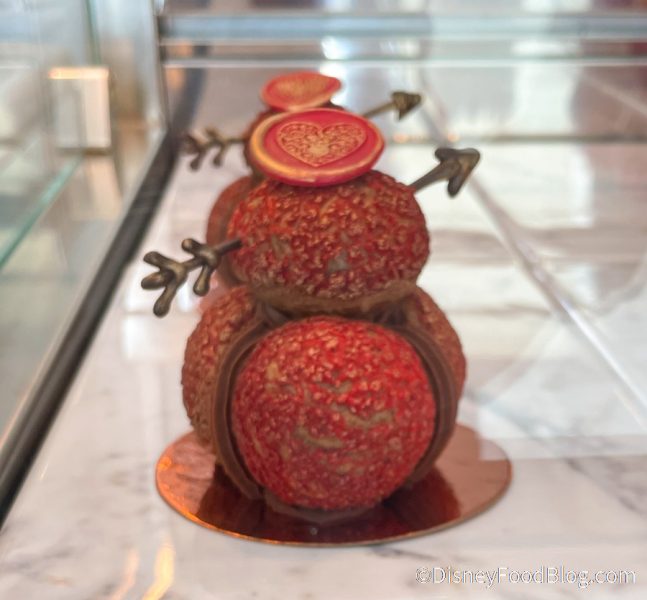 The Hazelnut-Caramel Profiteroles also got a Valentine’s Day makeover. They’re now red with a pretty chocolate heart on top with Cupid’s arrow running through the top profiterole. These are $5.99 for the four stacked chocolate cream puffs.