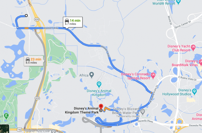 If you’re wondering how close this is to Disney World, here’s a look at what the directions look like from the hotel (the white dot to the left) to Disney’s Animal Kingdom. One path was only about a 14 minute drive away from the park when we ran the directions in the afternoon.