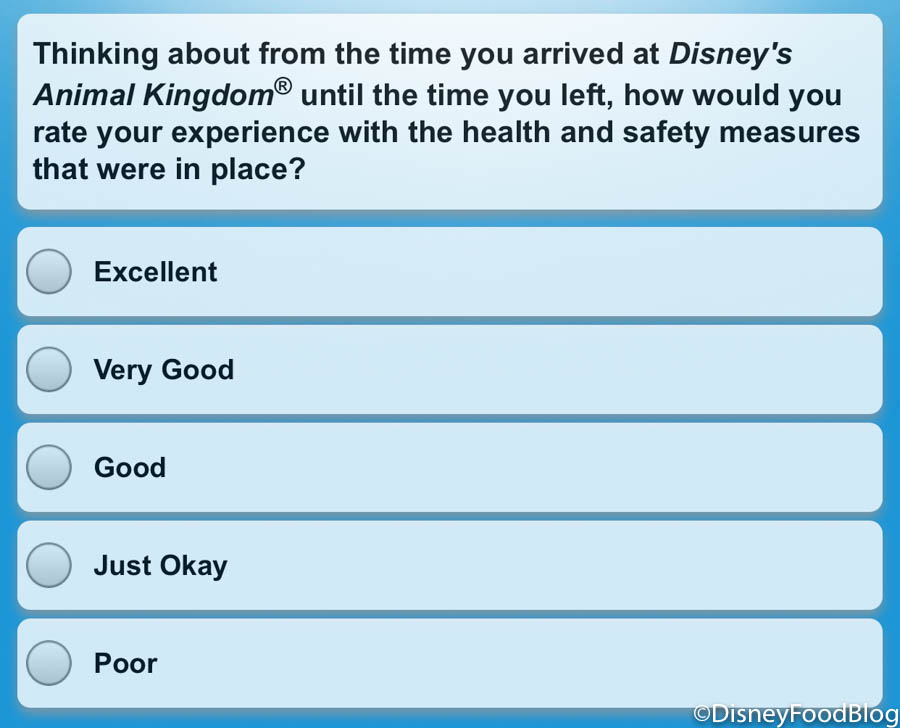 As we’ve seen with many recent surveys, Disney asked several questions about the current health measures that are in use in the park. There were some more broad questions that spoke to the health experience overall as well as some similar ones that spoke to the security experience.