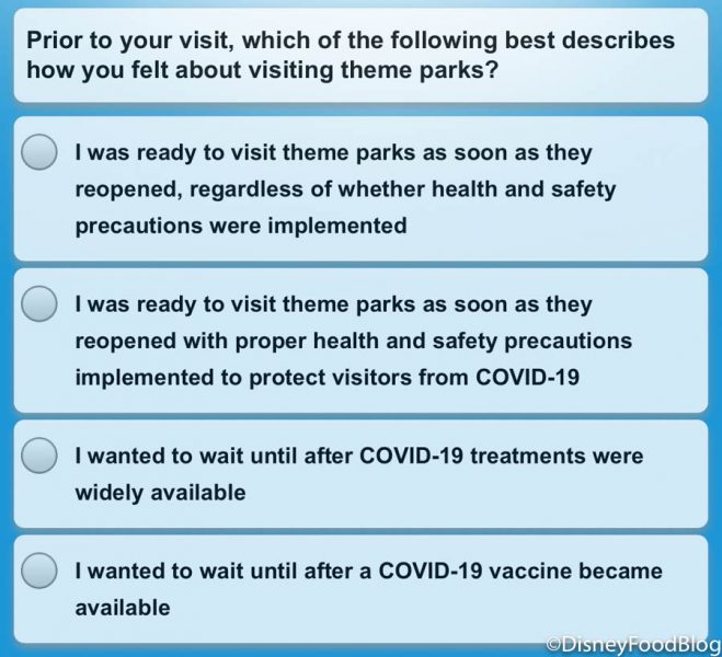 Interestingly enough, the survey even featured a question asking about the potential negative impact from other guests’ behavior. This has sometimes been an issue with the health measures in the parks.